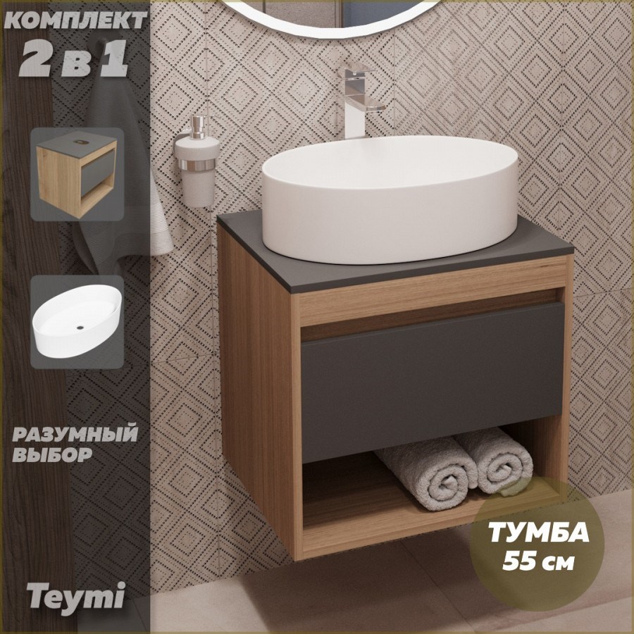 Тумба подвесная с раковиной для ванной 55 см Teymi Ritta корпус дуб фасад графит раковина Lori 50 F03309
