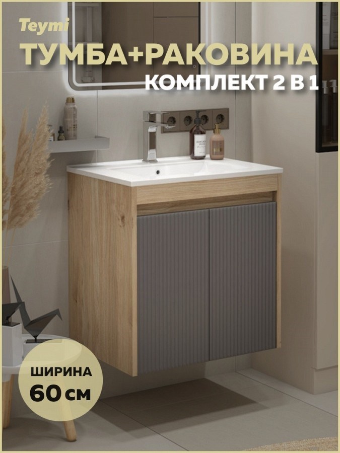 Тумба подвесная с раковиной для ванной 60 см Teymi Netta корпус дуб фасад графит раковина Ritta 60 F16020 — современное и практичное решение для стильных интерьеров, где важно эффективно использовать каждый метр и при этом подчеркнуть элегантный дизайн.