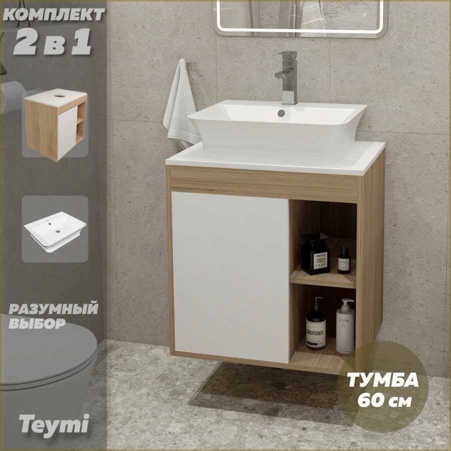 Тумба подвесная с раковиной для ванной 60 см Teymi Nura корпус дуб фасад белый раковина Aina 49 F03440