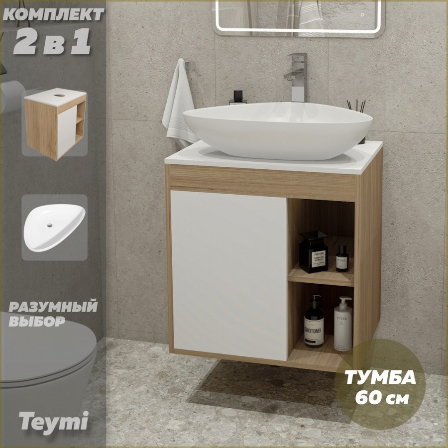 Тумба подвесная с раковиной для ванной 60 см Teymi Nura корпус дуб фасад белый раковина Ellie 60 F03432
