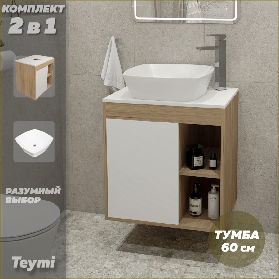 Тумба подвесная с раковиной для ванной 60 см Teymi Nura корпус дуб фасад белый раковина Kati 43 F03437