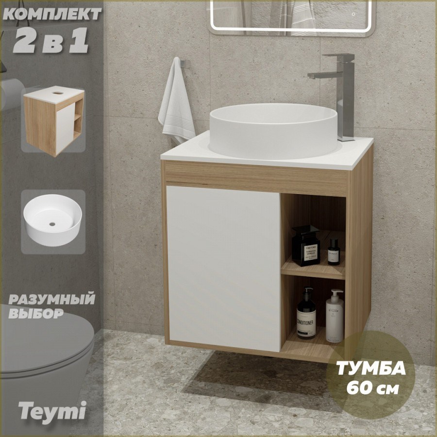 Тумба подвесная с раковиной для ванной 60 см Teymi Nura корпус дуб фасад белый раковина Lina D41 F03443
