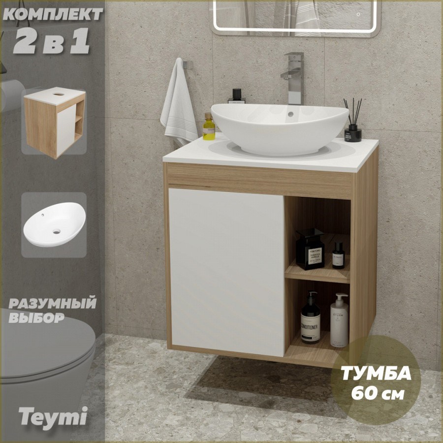 Тумба подвесная с раковиной для ванной 60 см Teymi Nura корпус дуб фасад белый раковина Lori 60 F03438