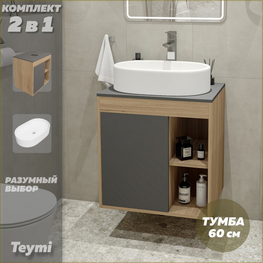 Тумба подвесная с раковиной для ванной 60 см Teymi Nura корпус дуб фасад графит раковина Iva 52 F03459