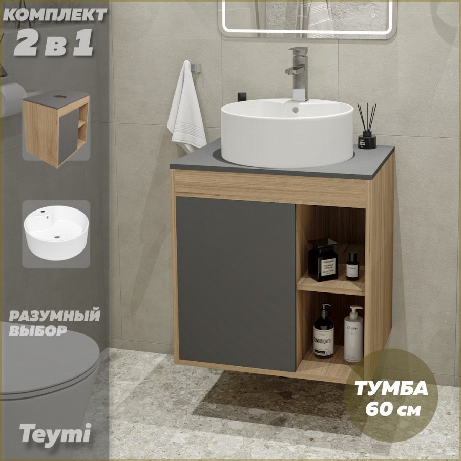 Тумба подвесная с раковиной для ванной 60 см Teymi Nura корпус дуб фасад графит раковина Lina Pro D40 F03477