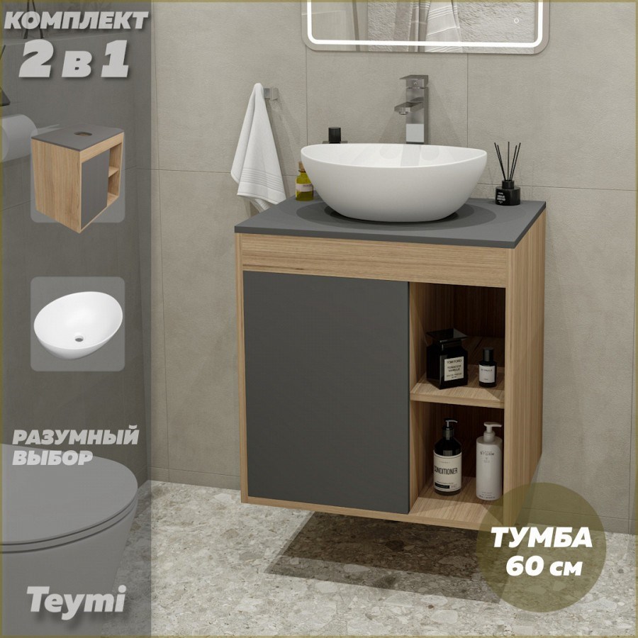 Тумба подвесная с раковиной для ванной 60 см Teymi Nura корпус дуб фасад графит раковина Lori 40 F03467