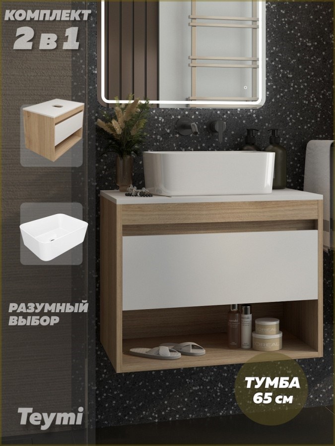 Тумба подвесная с раковиной для ванной 65 см Teymi Ritta корпус дуб фасад белый раковина Helmi Mini 40 F15063