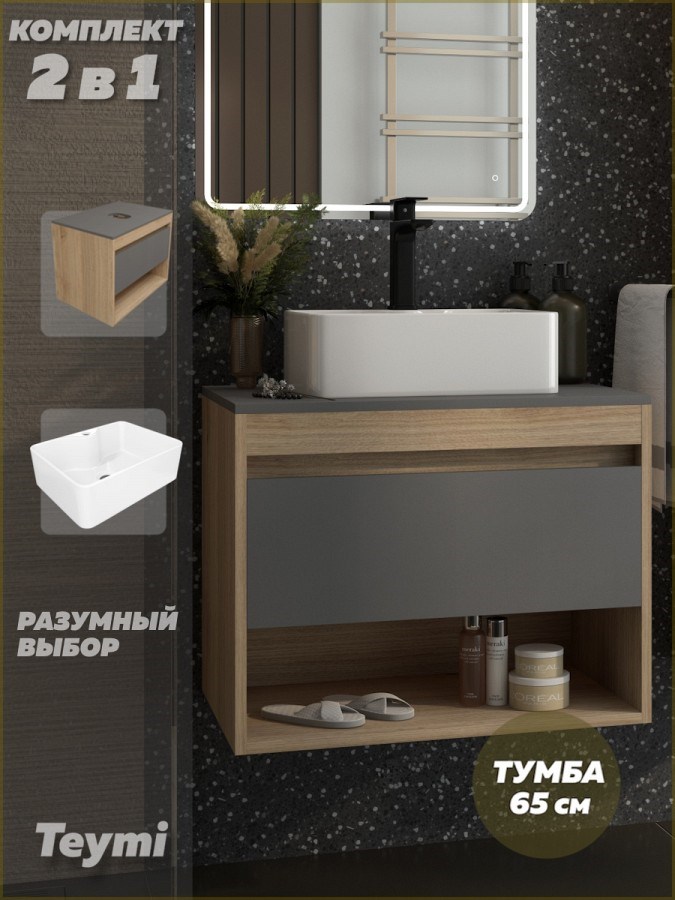 Тумба подвесная с раковиной для ванной 65 см Teymi Ritta корпус дуб фасад графит раковина Helmi Mini 41 F15032