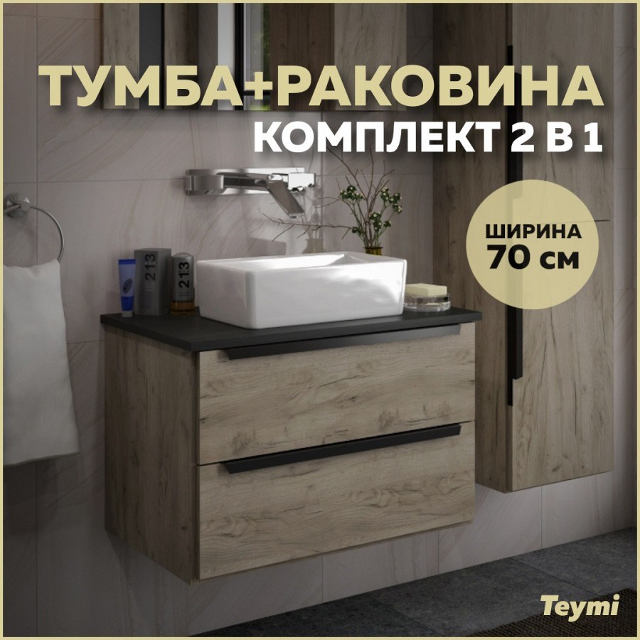 Тумба подвесная с раковиной для ванной 70 см Teymi Helmi фасад дуб столешница графит раковина Helmi Mini 38 T60302_T50304