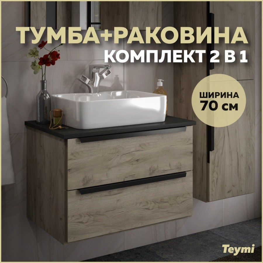 Тумба подвесная с раковиной для ванной 70 см Teymi Helmi фасад дуб столешница графит раковина Helmi S 48 F00197