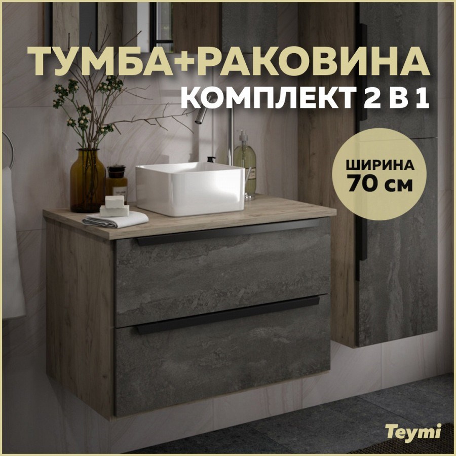 Тумба подвесная с раковиной для ванной 70 см Teymi Helmi фасад серый камень столешница дуб раковина Helmi Mini 24 F00194
