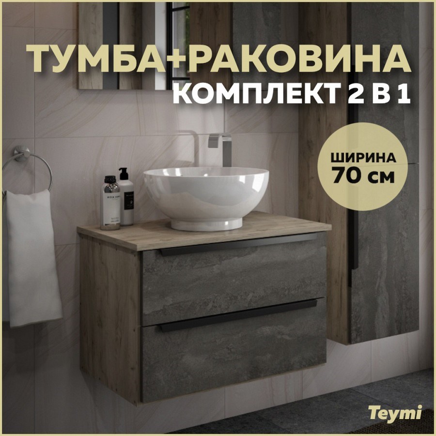 Тумба подвесная с раковиной для ванной 70 см Teymi Helmi фасад серый камень столешница дуб раковина Lina kuppi D40 T60307_T50103