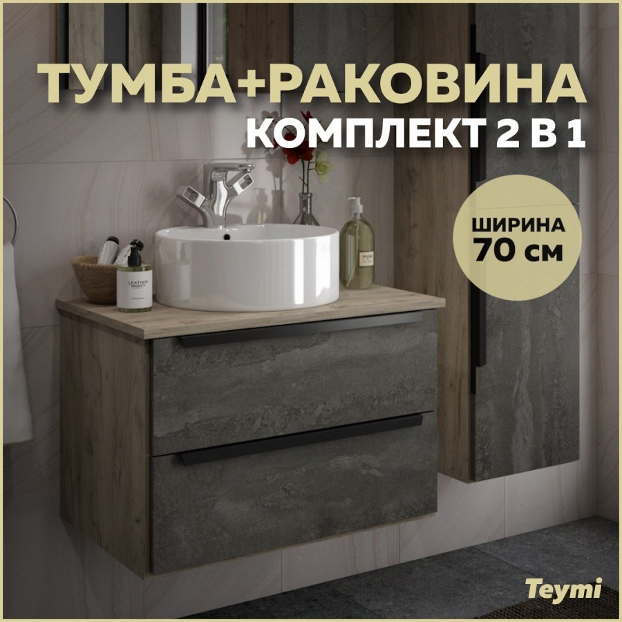 Тумба подвесная с раковиной для ванной 70 см Teymi Helmi фасад серый камень столешница дуб раковина Lina Pro D40 F00186
