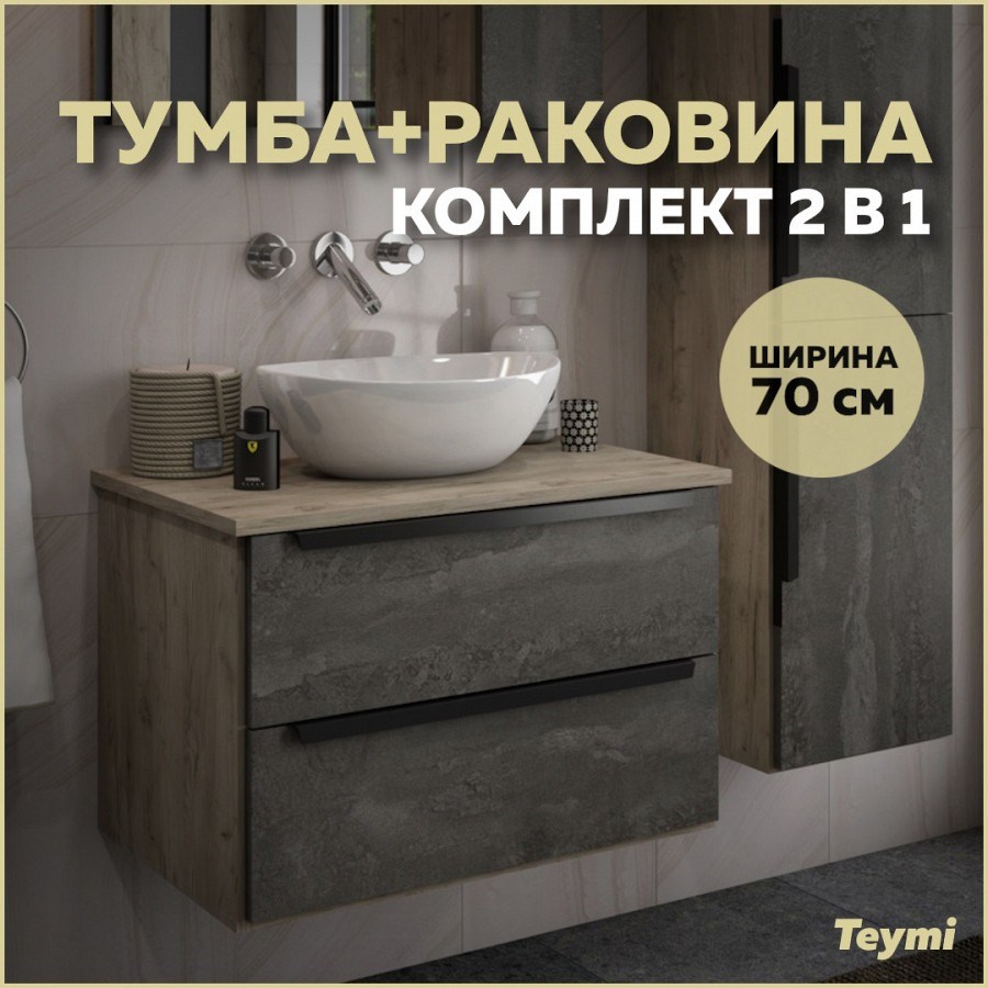 Тумба подвесная с раковиной для ванной 70 см Teymi Helmi фасад серый камень столешница дуб раковина Lori 40 F00206