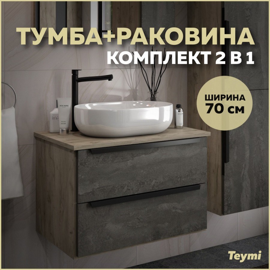 Тумба подвесная с раковиной для ванной 70 см Teymi Helmi фасад серый камень столешница дуб раковина Solli 48 F00352