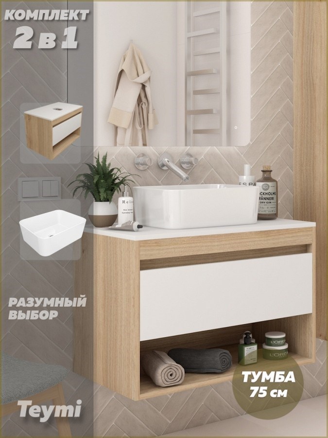 Тумба подвесная с раковиной для ванной 75 см Teymi Ritta корпус дуб фасад белый раковина Helmi Mini 40 F15065