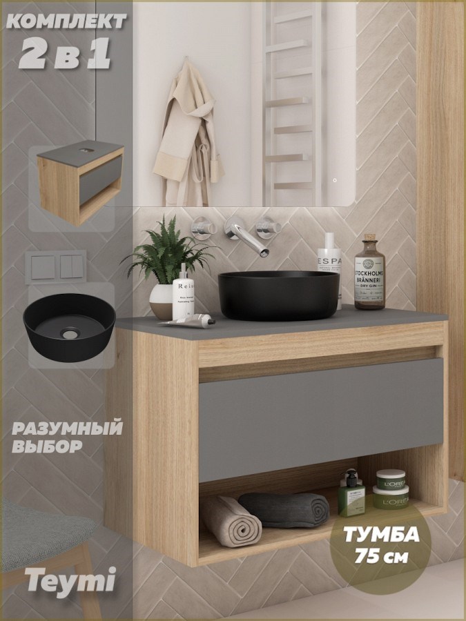 Тумба подвесная с раковиной для ванной 75 см Teymi Ritta корпус дуб фасад графит раковина Lina D31 черная матовая F15114