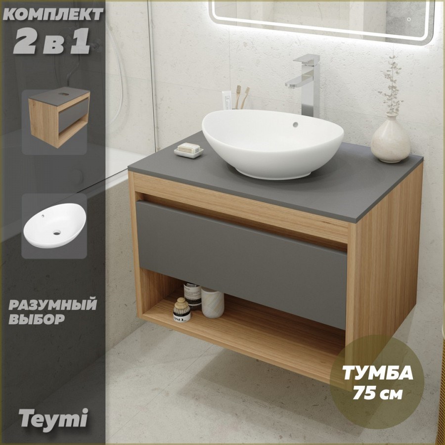 Тумба подвесная с раковиной для ванной 75 см Teymi Ritta корпус дуб фасад графит раковина Lori 60 F03413