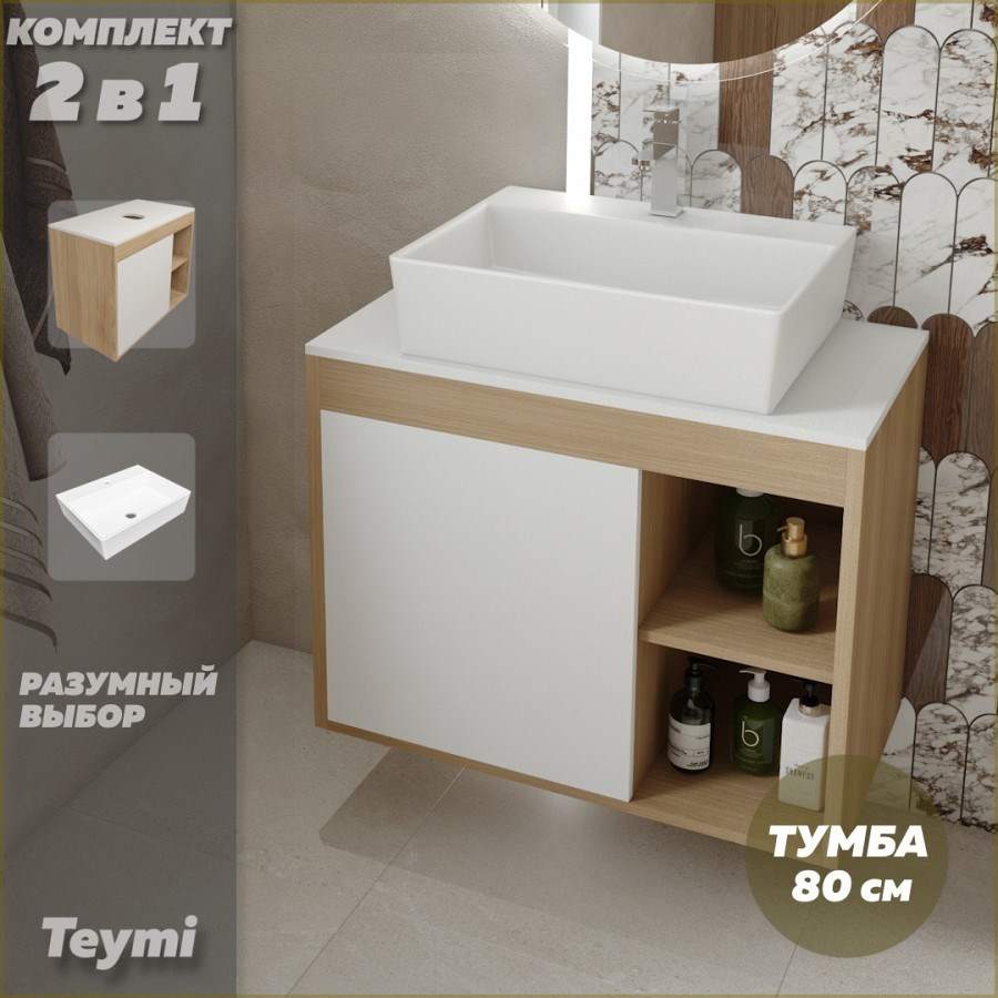 Тумба подвесная с раковиной для ванной 80 см Teymi Nura корпус дуб фасад белый раковина Aina 56 F13223