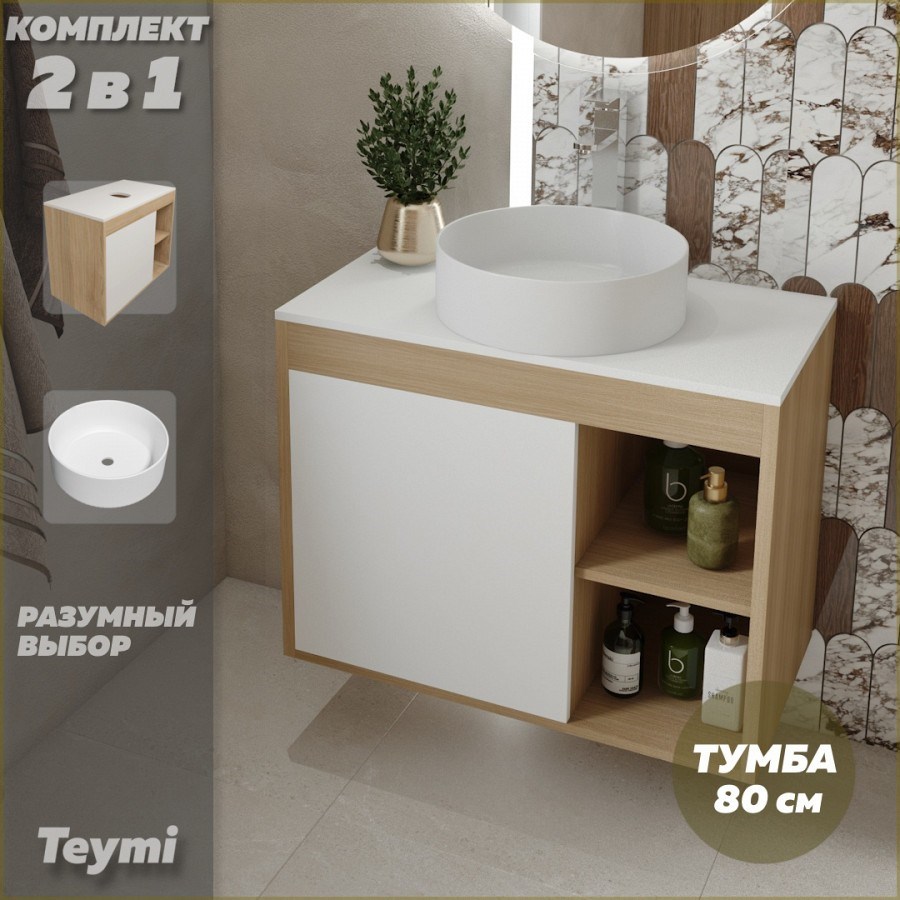Тумба подвесная с раковиной для ванной 80 см Teymi Nura корпус дуб фасад белый раковина Lina D41 F13217