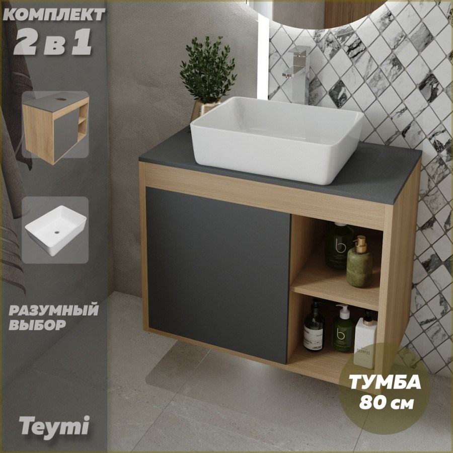 Тумба подвесная с раковиной для ванной 80 см Teymi Nura корпус дуб фасад графит раковина Helmi 50 F13204
