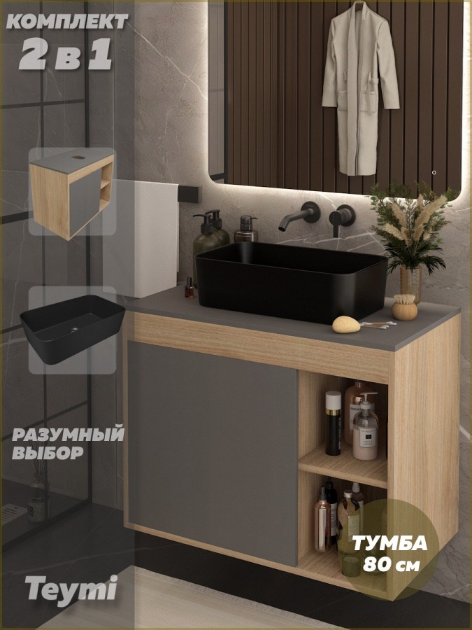 Тумба подвесная с раковиной для ванной 80 см Teymi Nura корпус дуб фасад графит раковина Helmi Mini 48 черная матовая F15170