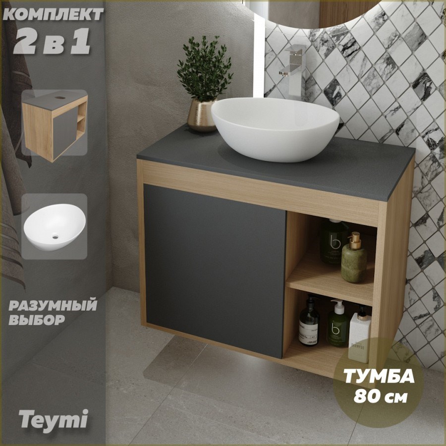 Тумба подвесная с раковиной для ванной 80 см Teymi Nura корпус дуб фасад графит раковина Lori 40 F13216