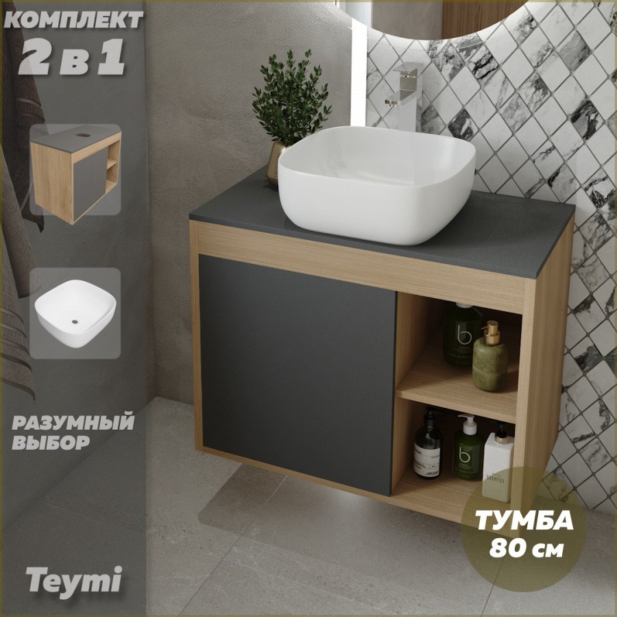 Тумба подвесная с раковиной для ванной 80 см Teymi Nura корпус дуб фасад графит раковина Solli 41 F13194