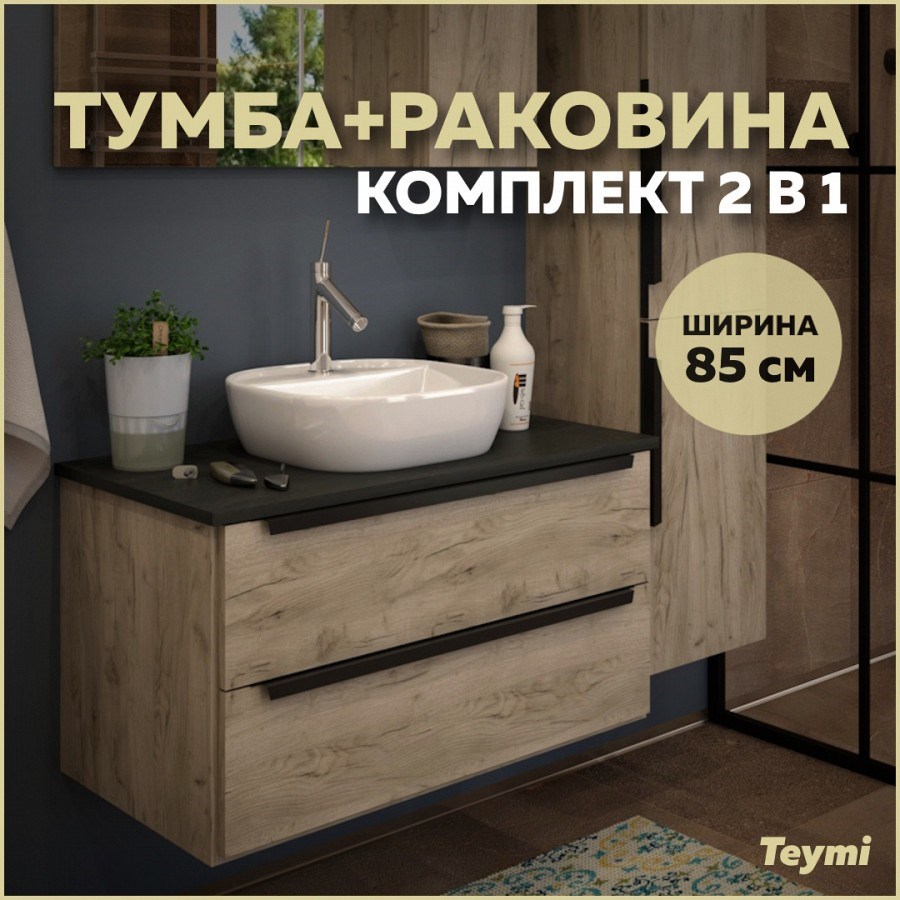 Тумба подвесная с раковиной для ванной 85 см Teymi Helmi фасад дуб столешница графит раковина Solli 40 F00191