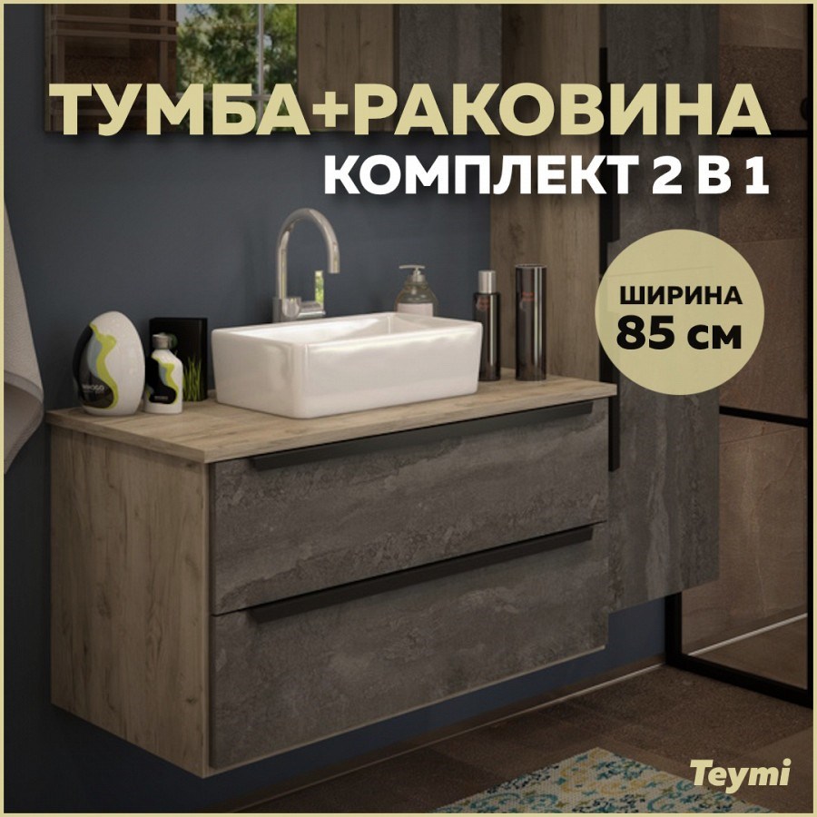 Тумба подвесная с раковиной для ванной 85 см Teymi Helmi фасад серый камень столешница дуб раковина Helmi Mini 38 T60309_T50304