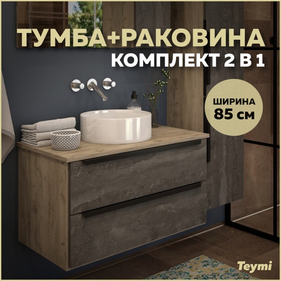 Тумба подвесная с раковиной для ванной 85 см Teymi Helmi фасад серый камень столешница дуб раковина Lina D35 F00184