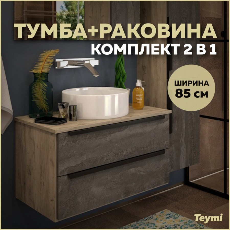 Тумба подвесная с раковиной для ванной 85 см Teymi Helmi фасад серый камень столешница дуб раковина Lina D41 F00180