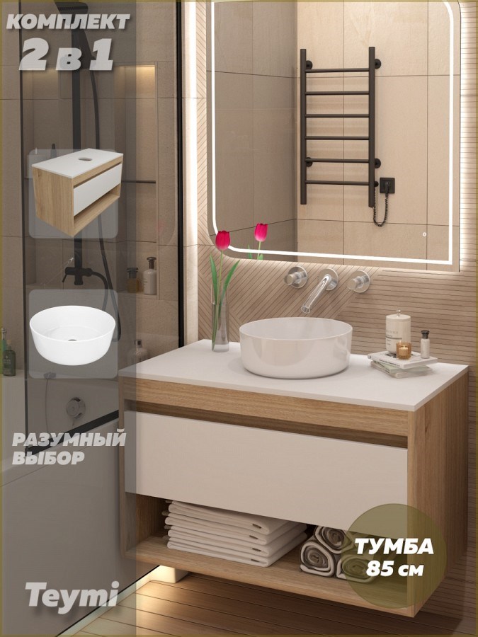 Тумба подвесная с раковиной для ванной 85 см Teymi Ritta корпус дуб фасад белый раковина Lina D31 F15043