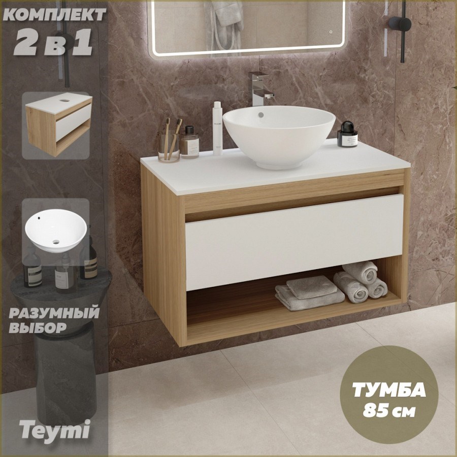 Тумба подвесная с раковиной для ванной 85 см Teymi Ritta корпус дуб фасад белый раковина Lina kuppi D40 F11664