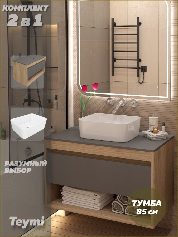 Тумба подвесная с раковиной для ванной 85 см Teymi Ritta корпус дуб фасад графит раковина Helmi Mini 40 F15068