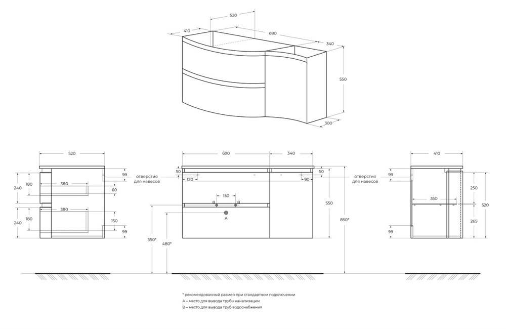 Тумба с раковиной подвесная CEZARES VAGUE 104 Nero Opaco, левосторонняя