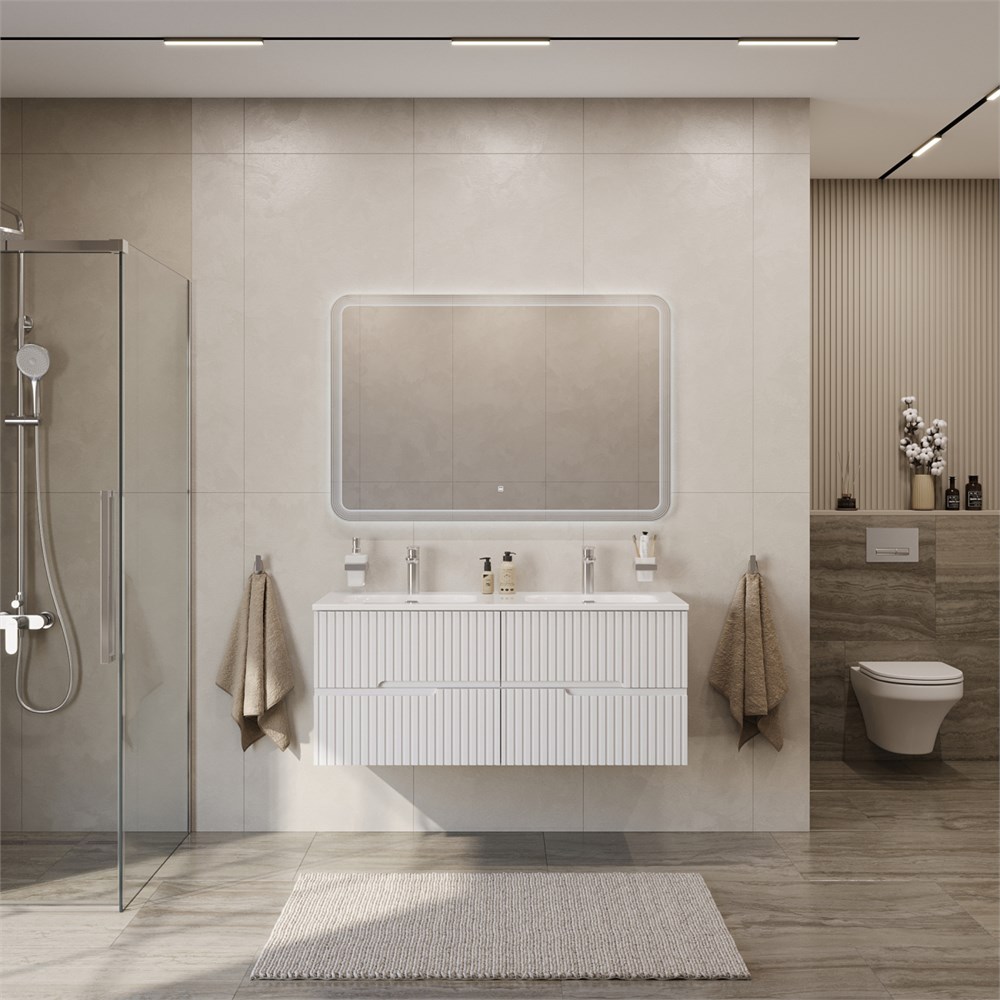 Тумба с раковиной подвесная с четырьмя ящиками CEZARES DUET-N 120 Bianco Lucido, раковина белая с двумя чашами CZR-8073-120-2