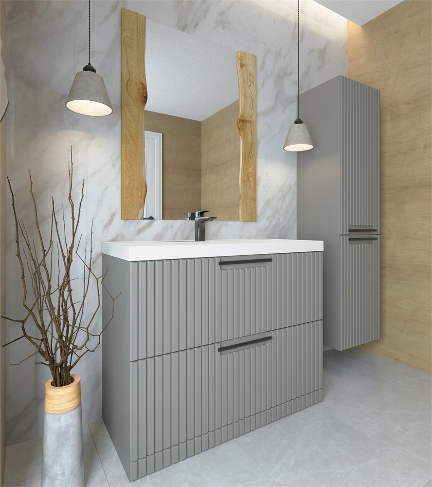 Глубокая вертикальная фрезеровка фасадов придает уникальность тумбе и создает объем, что является очень интересным дизайнерским решением.