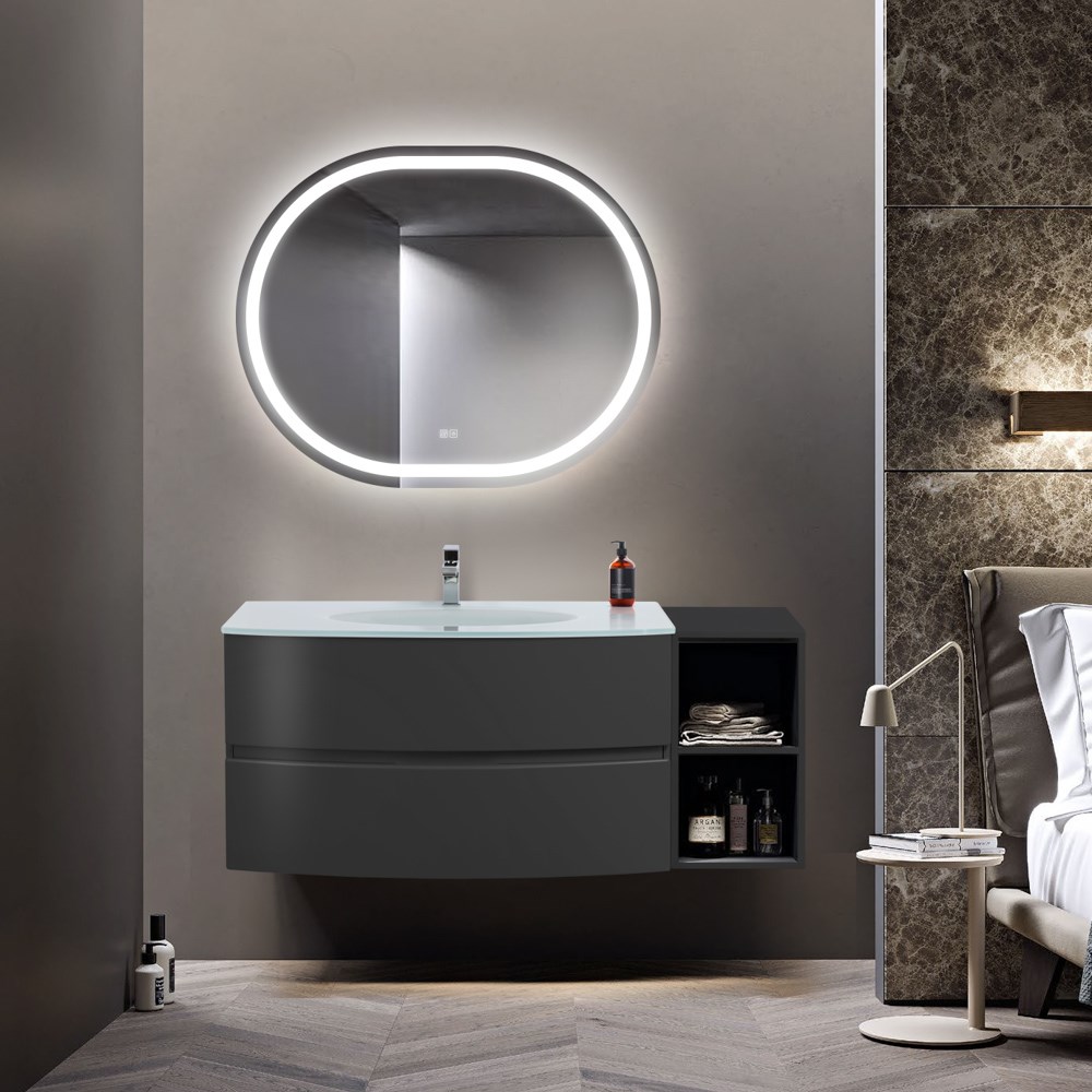 Тумба со стеклянной раковиной подвесная и открытым шкафчиком CEZARES ELETTRA 130 Grafite, раковина белая