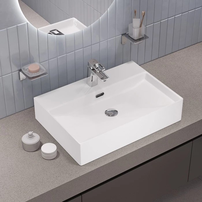 Стильный умывальник Bild для ванной комнаты актуального лаконичного дизайна с удобной полочкой подойдёт к любому современному интерьеру. Размер 600х420х130 мм. Два варианта установки: подвесной и настольный.