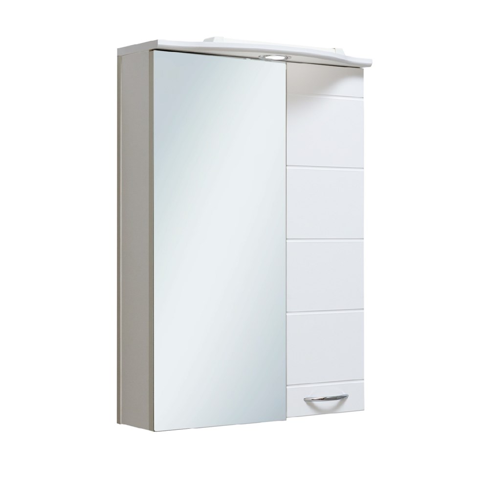 Зеркальный шкаф оборудован одним врезным светодиодным светильником и розеткой с выключателем. Шкаф с двумя отделениями: справа - с белой дверкой, слева - с зеркальной. В каждом отделении - по две внутренние полки. Петли со встроенным доводчиком, ручка -1 шт. Выпускается только в правом исполнении.
