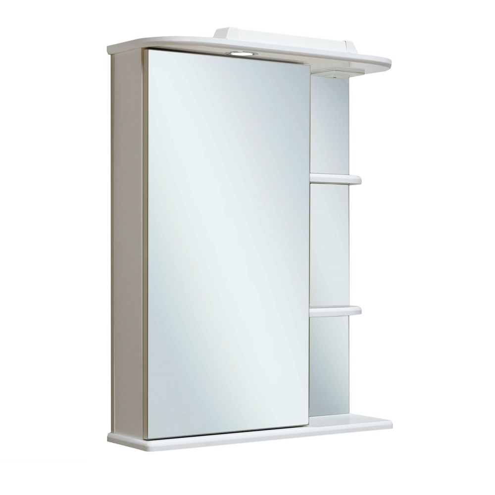 Зеркальный шкаф оборудован одним врезным светодиодным светильником 220В и розеткой с выключателем. Слева - шкаф с зеркальной дверцей и двумя внутренними полками, справа - две открытые полочки. Петли со встроенным доводчиком. Выпускается только в левом исполнении.
