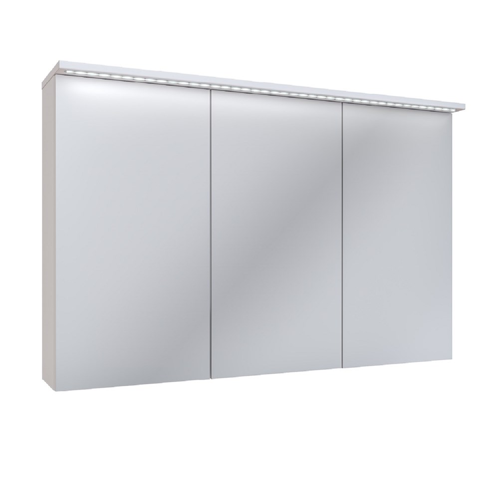 Зеркальный шкаф c тремя распашными зеркальными фасадами. Комплектуется светодиодной подсветкой, встроенной во врезной алюминиевый профиль, и розеткой с выключателем (внутри шкафа). Петли со встроенным доводчиком. Внутри каждого отделения шкафа по 2 встроенные полки.