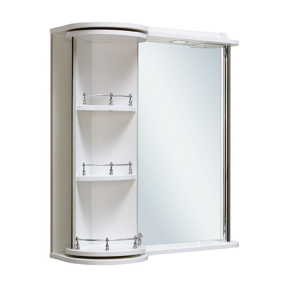 Зеркальный шкаф оборудован одним светодиодным светильником и розеткой с выключателем. Слева - три открытые полочки с декоративными рейлингами, расположенные на крутящемся основании, справа - вертикальная хромированная труба. Выпускается только в левом исполнении.