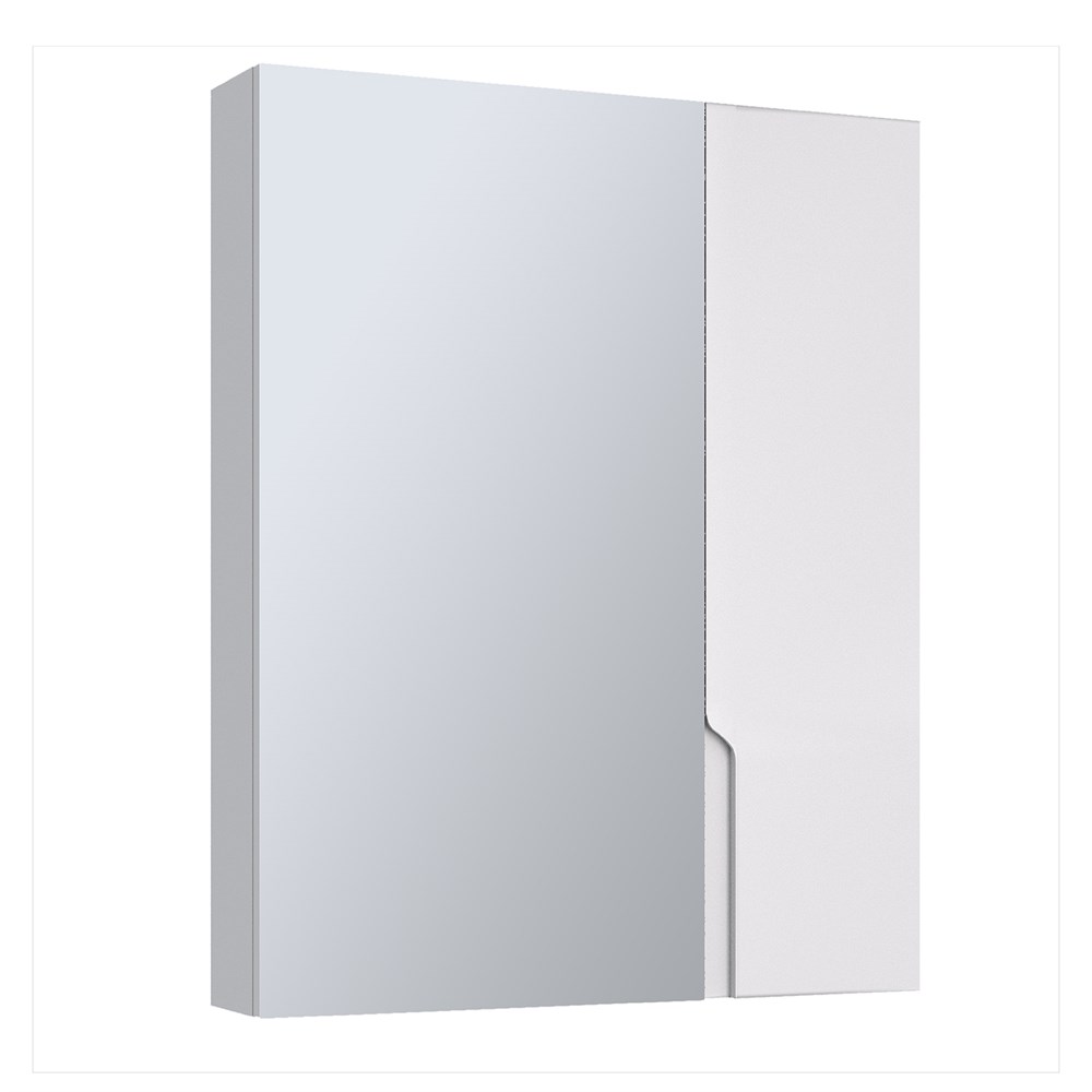 Зеркальный шкаф без подсветки c двумя ассиметричными дверками, одна из которых зеркальная, а вторая - белая. Внутри шкафа - две горизонтальные полки. Петли со встроенным доводчиком.