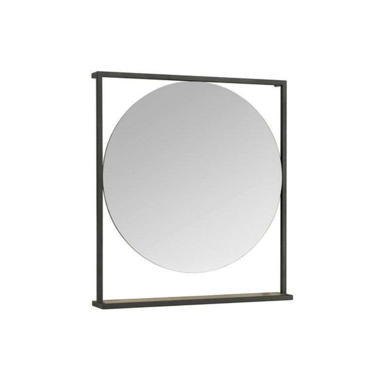 Черные металлические профили обрамляют круглое зеркало, под которым находится полочка из влагостойкой ламинированной плиты в цвете Дуб Эндгрейн.
