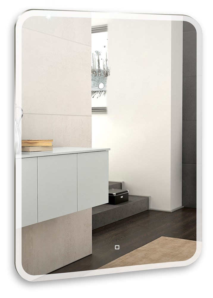 Зеркало оснащено сенсорным выключателем с функцией плавного диммирования с запоминанием последнего значения. Короткое касание светящейся области включает/выключает подсветку, длительное касание меняет яркость свечения.