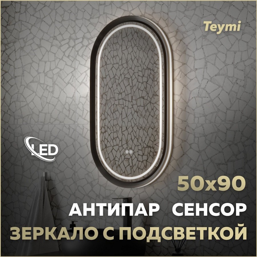 Зеркало настенное с подсветкой в ванную Teymi Iva Magic Black 500х900 LED сенсор антипар T20622